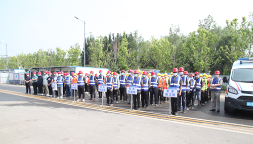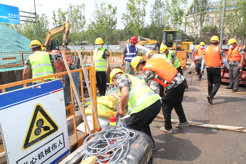 本次演練以因強(qiáng)降雨造成滹沱河和太平河洪水爆發(fā),即將對(duì)項(xiàng)目部造成威脅為背景,模擬項(xiàng)目部員工發(fā)現(xiàn)險(xiǎn)情后,立刻向項(xiàng)目部防汛值班領(lǐng)導(dǎo)報(bào)告,值班領(lǐng)導(dǎo)向指揮長(zhǎng)進(jìn)行報(bào)告,指揮長(zhǎng)下令立刻啟動(dòng)應(yīng)急預(yù)案,各應(yīng)急小組迅速進(jìn)入應(yīng)急備戰(zhàn)狀態(tài),配備防汛機(jī)具,迅速奔赴現(xiàn)場(chǎng)搶險(xiǎn),設(shè)置警示標(biāo)志和安全警戒區(qū)域,組織人員疏散,搶救重要物資,加固土坡,裝運(yùn)沙袋,同時(shí)組織修復(fù)道路,恢復(fù)交通,保證撤離路線暢通,進(jìn)行搶險(xiǎn)救援全過(guò)程。